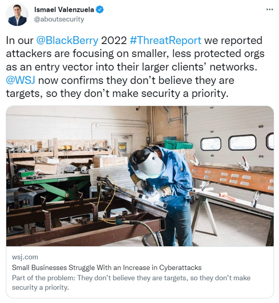 I was just leaving my Birds of a Feather roundtable discussion at the recent RSA conference when I saw the following tweet from BlackBerry’s VP of Threat Intelligence about cyberattacks targeting small- and medium-sized businesses (SMBs):