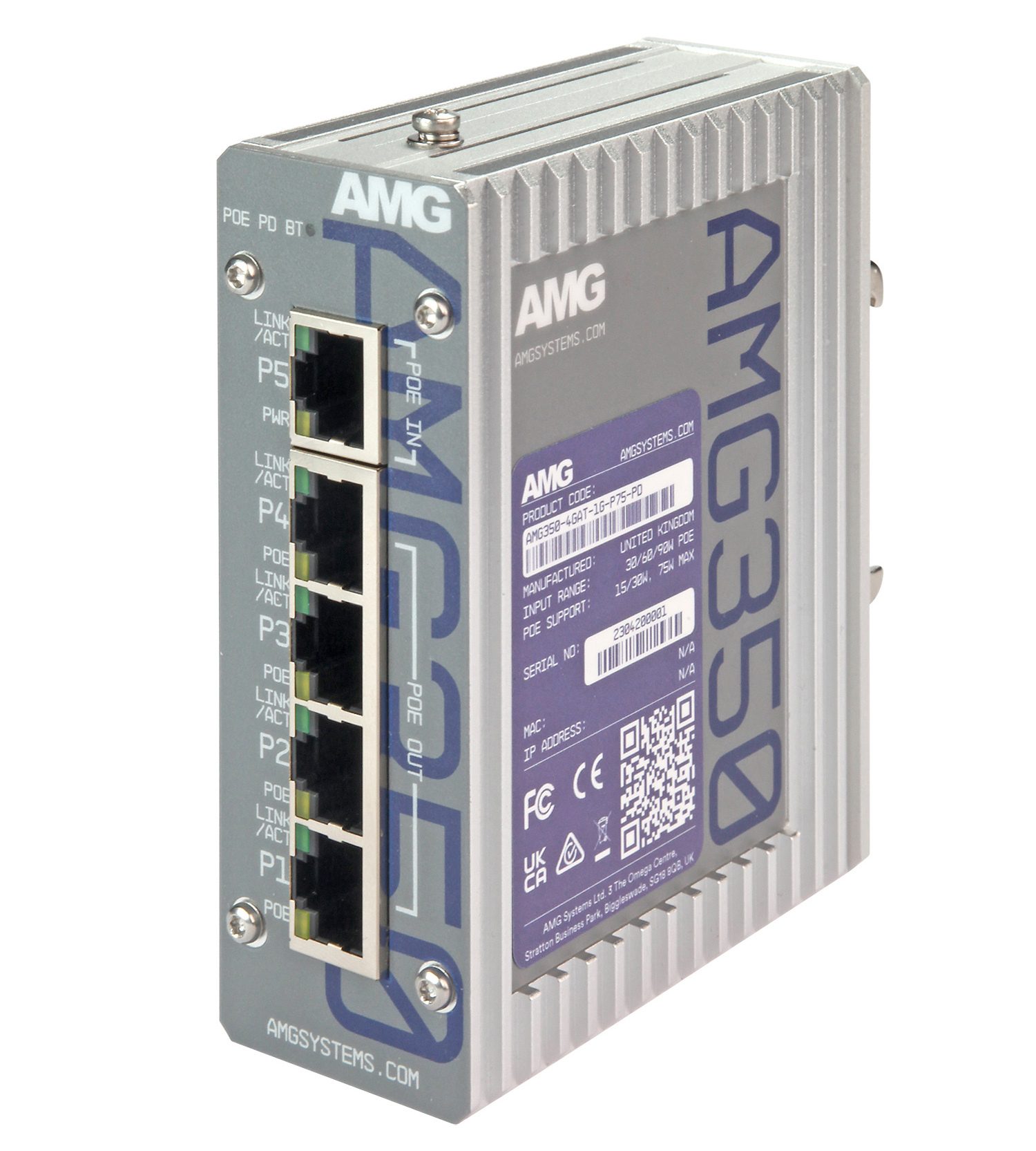 AMG Systems’ the AMG350-4GAT-1G-P75-PD model 5-port Ethernet switch can be supplied IEEE802.3bt PoE and deliver IEEE802.3 af/at PoE to four edge-powered devices (PD), powering the technology that security teams use to keep their organizations safe. The AMG350 requires no external power supply and is powered by PoE. This model is compatible with any manufacturer’s IEEE802.3at or bt-compliant PoE source device (PSE) and can function as a multi-port repeater for situations when distances above 100M (328ft) are required. Image courtesy of AMG Systems