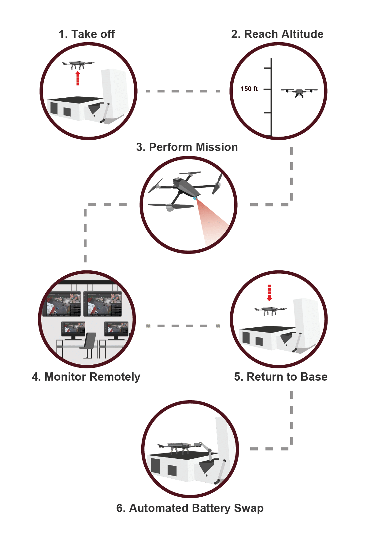 The moment a 911 call or an alarm is activated, the system springs into action autonomously. A drone is dispatched to the precise location of the incident, providing a visual feed to the response team through live video streaming. This system introduces Robotic AI Intrusion Detection (RAID). Through autonomous patrols, drones meticulously sweep areas of interest surrounding the facility. Alerts are judiciously dispatched exclusively upon detecting human and vehicle intruders. Image courtesy of Nightingale Security