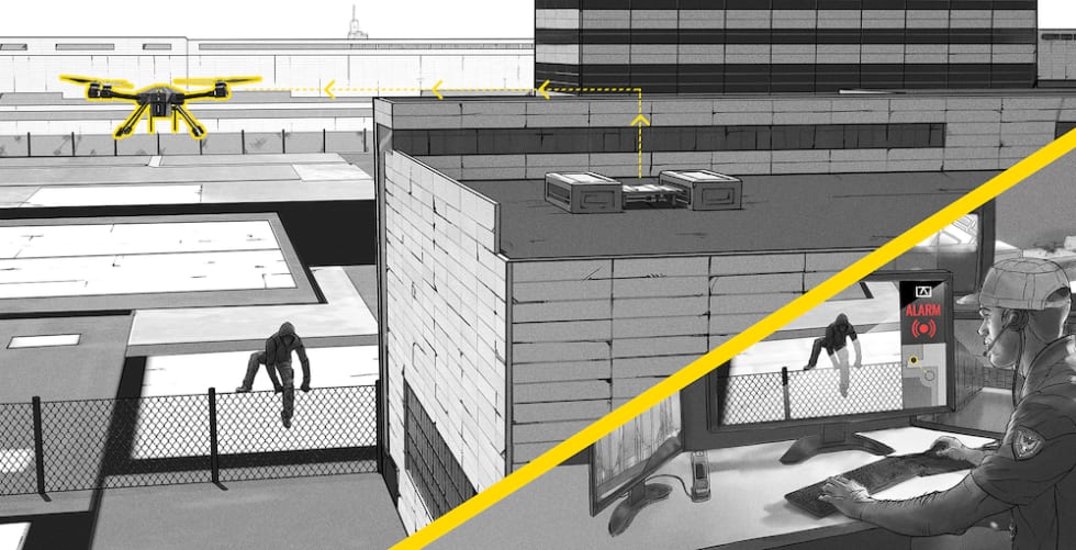 Guardian is an end-to-end hardware/software system that enables full automation. Every mission is live streamed to the cloud so users can monitor their systems from anywhere. The system includes pre-programmed or point-and-click piloting to provide unprecedented aerial and mobile vantage points, live EO/IR video monitoring, and advanced data analytics. And, with third party alarm integrations, the security drone system can investigate, clear, or escalate alarms. Image courtesy of Asylon
