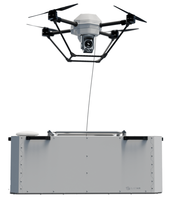 Khronos is a completely fully automated system which includes the tethered drone, its power and landing station, and its ground control software. The entire solution is designed to be integrated onto a fixed platform or vehicle to safely enhance mobile operations and increase flexibility. Khronos can be deployed without leaving the vehicle. Image courtesy of Elistair